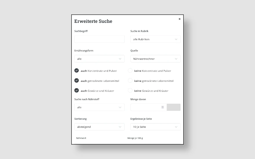 Wenn Dir eine "normale" Suche zu viele Lebensmittel listet, kannst Du Deine Suche nach bestimtmen Kriterien einschränken. Dazu benutzt Du die...
