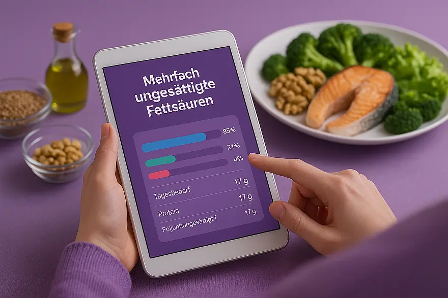 Energie (kcal) Energie (kJ) Fett Eiweiß Kohlenhydrate Ballaststoffe Wasser Vitamin A Retinoläquivalent Retinol Beta-Carotin Vitamin B1 Thiamin Vitamin B2 Riboflavin Vitamin B3 Niacin, Nicotinsäure Vitamin B3 Niacinäquivalent Vitamin B5 Pantothensäure Vitamin B6 Pyridoxin Vitamin B7 Biotin (Vitamin H) Vitamin B9 gesamte Folsäure Vitamin B12 Cobalamin Vitamin C Ascorbinsäure Vitamin D Calciferole Vitamin E Vitamin K Natrium Kalium Calcium Magnesium Phosphor Schwefel Chlorid Eisen Zink Kupfer Mangan Fluorid Iodid Broteinheiten Broteinheiten Broteinheiten Mannit Sorbit Xylit Summe Zuckeralkohole Glucose (Traubenzucker) Fructose (Fruchtzucker) Galactose (Schleimzucker) Monosaccharide (1 M) Saccharose (Rübenbenzucker) Maltose (Malzzucker) Lactose (Milchzucker) Disaccharide (2 M) Oligosaccharide, resorbierbar (3 - 9 M) Oligosaccharide, nicht resorbierbar Glykogen (tierische Stärke) Stärke Polysaccharide (> 9 M) Isoleucin Leucin Lysin Methionin Cystein Phenylalanin Tyrosin Threonin Tryptophan Valin Arginin Histidin Essentielle Aminosäuren Alanin Asparaginsäure Glutaminsäure Glycin Prolin Serin Nichtessentielle Aminosäuren Harnsäure Purin Butansäure / Buttersäure Hexansäure / Capronsäure Octansäure / Caprylsäure Decansäure / Caprinsäure Dodecansäure / Laurinsäure Tetradecansäure / Myristinsäure Pentadecansäure Hexadecansäure / Palmitinsäure Heptadecansäure Octadecansäure / Stearinsäure Eicosansäure / Arachinsäure Decosansäure / Behensäure Tetracosansäure / Lignocerinsäure Gesättigte Fettsäuren Tetradecensäure Pentadecensäure Hexadecensäure / Palmitoleinsäure Heptadecensäure Octadecensäure / Ölsäure Omega 9 Eicosensäure Decosensäure / Erucasäure Omega 9 Tetracosensäure / Nervonsäure Omega 9 Einfach ungesättigte Fettsäuren Hexadecadiensäure Hexadecatetraensäure Octadecadiensäure / Linolsäure Omega 6 ALA - Linolensäure Omega 3 Stearidonsäure Omega 3 Nonadecatriensäure Eicosadiensäure Omega 6 Eicosatriensäure Omega 6 Eicosatetraensäure / Arachidonsäure Omega 6 EPA - Eicosapentaensäure Omega 3 Docosadiensäure Docosatriensäure Docosatetraensäure Docosapentaensäure Omega 3 DHA - Docosahexaensäure Omega 3 Mehrfach ungesättigte Fettsäuren Langkettige Fettsäuren Glycerin und Lipoide Cholesterin Kurzkettige Fettsäuren Mittelkettige Fettsäuren Poly-Pentosen Poly-Hexosen Poly-Uronsäure Cellulose Lignin Wasserlösliche Ballaststoffe Wasserunlösliche Ballaststoffe Alkohol Säuren (organisch) Rohasche